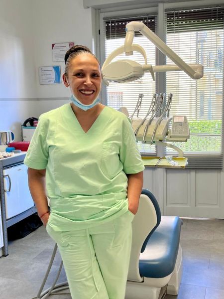 Sig.ra Mariangela Piccini (assistente studio odontoiatrico) aiuta i dottori a lavorare al meglio con i pazienti assistendo alle terapie mediche.